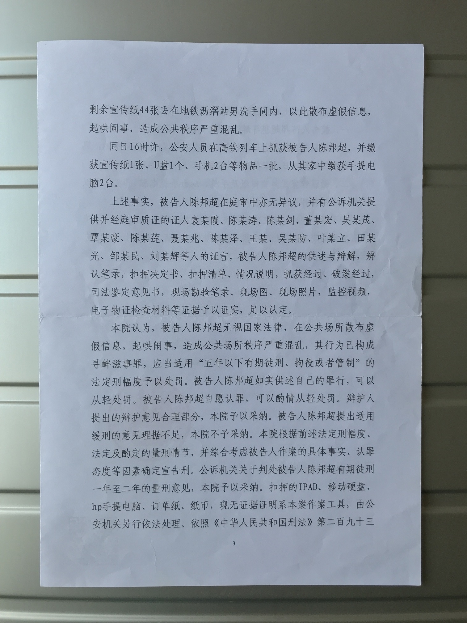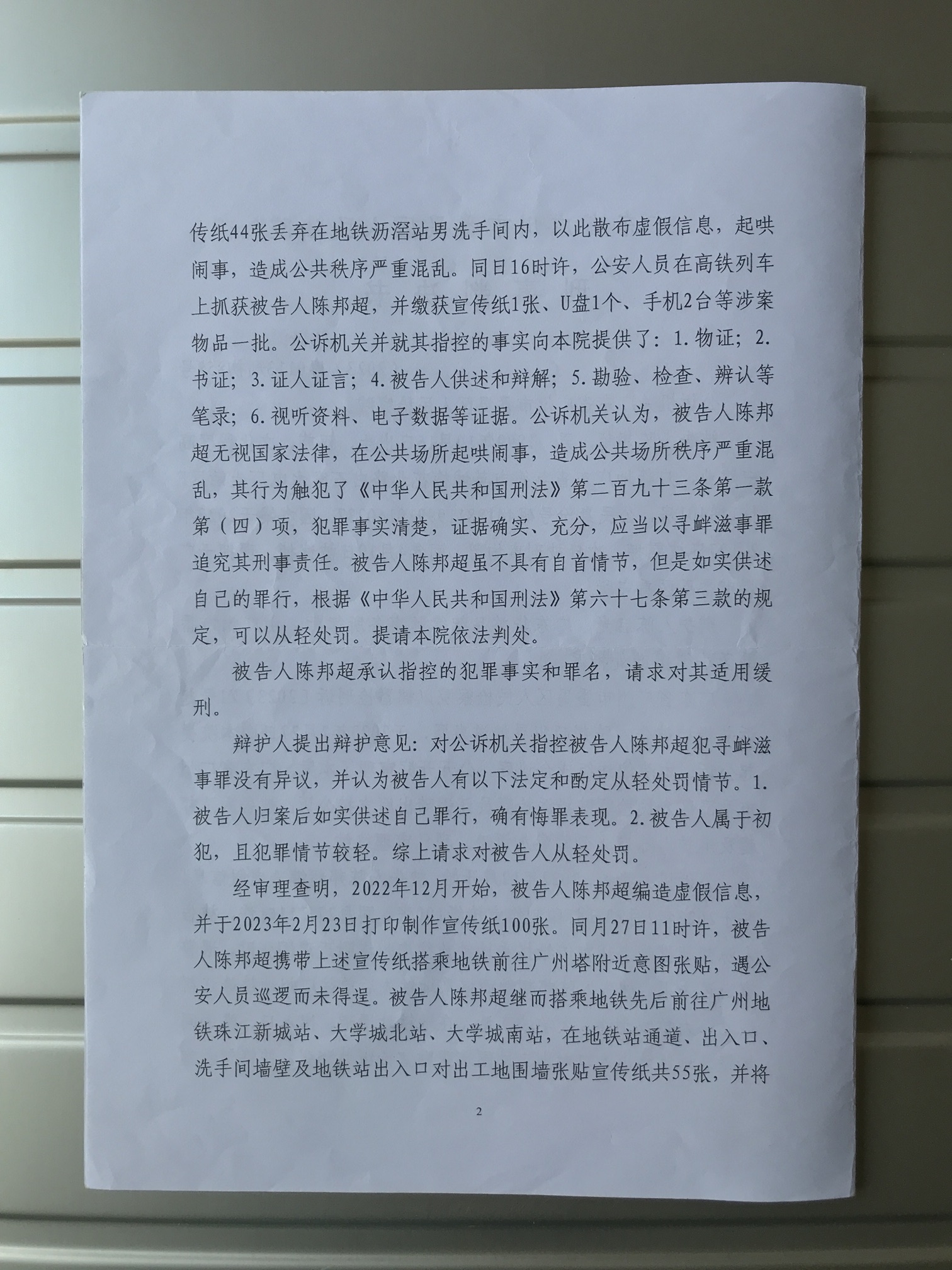 2023年2月27日早晨,陈邦超携带100份印好的《地铁宣言》海报,前往广州的地铁站点张贴。原定首个目标是地铁广州塔站,但因现场警戒森严,他转而前往珠江新城站、大学城北站、大学城南站等地张贴。他共张贴了55张海报,在发现异常后,将剩余部分藏于地铁洗手间,并换装离开。由于一时疏忽,陈邦超将一张折叠的副本留在了包内,这成为了他被定罪的最直接证据。 约一小时后,在一列离开广州的火车上,陈遭到警察抓捕。 被押回广州后,国安人员对他进行了威胁与嘲讽:“要是在朝鲜的话,你早就被枪毙了。”并表示:“这又不是一张白纸。” 白纸运动之后,当局对类似政治表达的敏感程度显而易见
